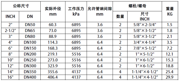 供货尺寸 • 2 – 16英寸/DN50 – DN400。 最大工作压力 • 支持的压力额定值从真空(29.9 in Hg/760 mm Hg)到1000 psi/6900 kPa/69 bar。 • 工作压力视管道材料、壁厚和尺寸而定。 应用 • 连接碳钢管。 • 工作温度视密封垫圈和/或密封选择而定。 • 提供设计用于限制轴向或角度移动的刚性管接头。